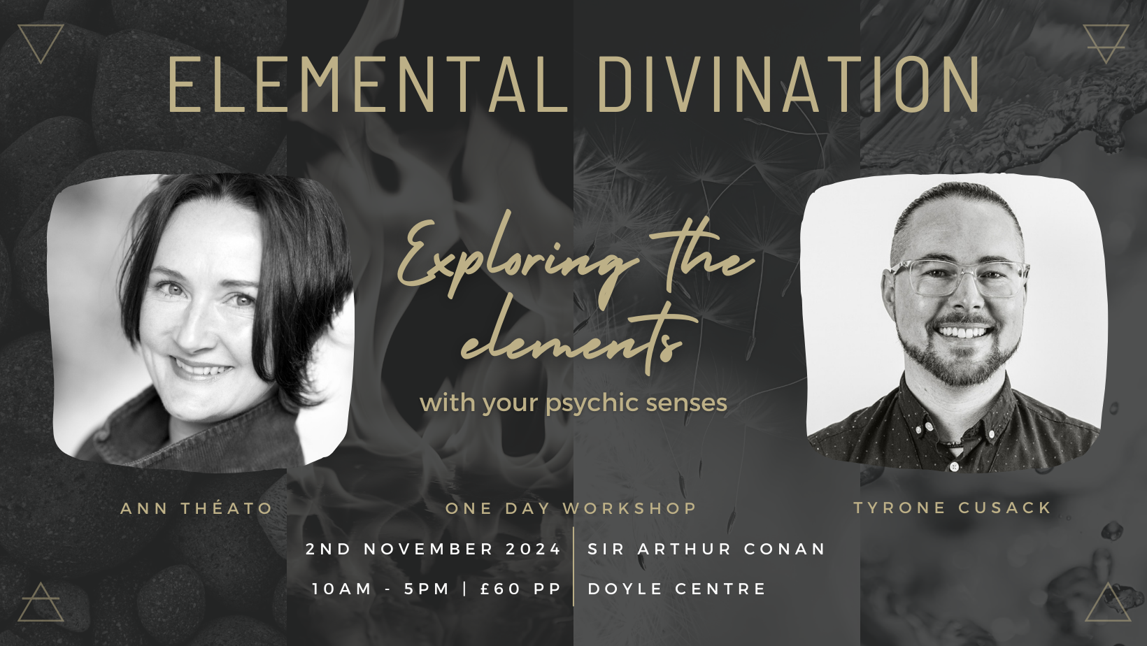 This workshop is taught by two professional Psychics and Mediums, Ann Théato and Tyrone Cusack, who have many years of experience between them in using a variety of divination tools and interpreting their symbology. Through mini tutorials, exercises and break-out groups, you will have an opportunity to work with other students and the magick of the elements.